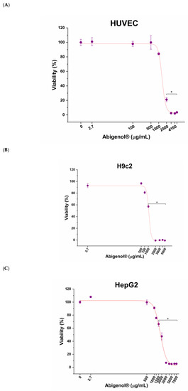 Impact of increasing concentrations of Abigenol®/AlbiPhenol® on in vitro HUVEC cells (A), H9c2 cells (B) and HepG2 cells (C). * p < 0.05 (n = 3).