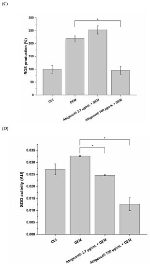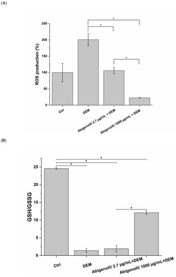To determine the inhibitory effect of Abigenol®/AlbiPhenol® on the production of ROS by cells following treatment with DEM, the DCFDA assay was performed. DCFDA (Merck KGaA) is a fluorogenic probe that measures the activity of hydroxyl and peroxyl groups and other ROS within the cell. After intracellular diffusion, DCFDA is deacetylated by cellular esterases to a non-fluorescent compound, which is later oxidized by ROS into 2′,7′-dichlorofluorescein (DCF), a highly fluorescent compound. Briefly, following exposure, the cultured cells were loaded with the DCFDA probe (20 µM) for 1 h. After the removal of the non-internalized probe by washing, fluorescence was detected with a multi-well plate reader (495 nm excitation and 529 nm emission). The obtained results are presented as a percentage compared to the untreated control.