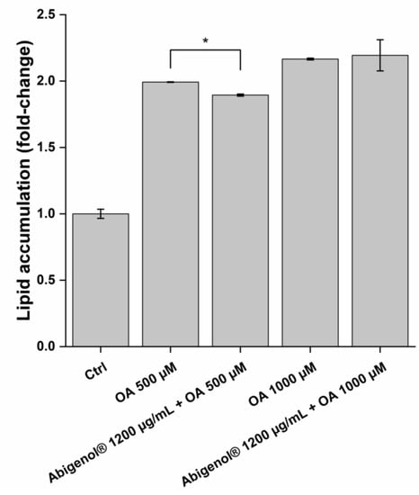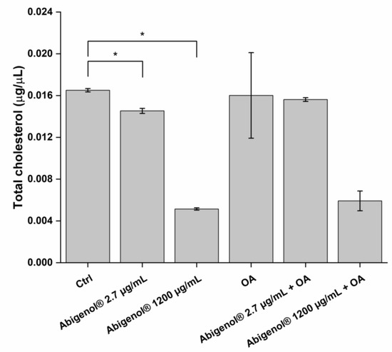 Hepatic steatosis is one of the major causes of liver dysfunction and disease. To investigate the extract’s impact on this process, the HepG2 liver cell line was treated with Abigenol®/AlbiPhenol® in a protective approach, as for the oxidative stress; then, the cells were exposed to oleic acid, a well-known inducer of fat and lipid accumulation. The anti-steatotic activity of Abigenol®/AlbiPhenol® was evaluated by determining the HepG2 intracellular levels of lipids, cholesterol, bile acids and triglycerides. Two different concentrations of oleic acid were used (0.5 and 1 mM) and the highest non-toxic concentration of the extract was tested (1200 µg/mL). As shown in Figure 9, Abigenol®/AlbiPhenol® was able to significantly reduce the hepatic lipid accumulation induced by oleic acid used at 0.5 mM, but not at 1 mM. Afterwards, cholesterol was extracted from the hepatocytes and quantified (Figure 10 and Table 5). In physiological conditions (the absence of oleic acid-induced steatosis), the extract at both tested concentrations significantly reduced the total cholesterol concentration compared to the untreated control. A concentration-dependent effect was observed, since there was a decrease of cholesterol equal to 12.0% and 68.8% following treatment with 2.7 and 1200 µg/mL of Abigenol®/AlbiPhenol®, respectively (Figure 10 and Table 5). However, when HepG2 cells were exposed to 0.5 mM oleic acid (steatotic conditions), the total cholesterol was only significantly lowered with Abigenol®/AlbiPhenol® at 1200 µg/mL, while no effect was observed with the bioavailable concentration (Figure 10 and Table 5). Most of the measured cholesterol was represented by free cholesterol, while esterified cholesterol was a very limited fraction. The ratio between free and esterified cholesterol was not affected by Abigenol®/AlbiPhenol® and/or oleic acid treatment (data not shown).