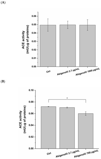 One of the major risk factors for CVDs is arterial hypertension, which accelerates the progression of atherosclerosis and cardiovascular events such as HF. The activation of the RAAS system plays a key role in arterial hypertension pathogenesis. Indeed, the ACE-mediated conversion of the hormone angiotensin I into angiotensin II promotes blood vessel constriction and blood pressure increase. Since ACE is expressed in both endothelial cells and cardiomyocytes [41,42], the potential ability of Abigenol®/AlbiPhenol® to inhibit ACE activity in vitro was investigated in order to understand whether it might be able to reduce vasoconstriction in vivo. As shown in Figure 12, the maximum non-toxic concentration was able to significantly reduce ACE activity in H9c2, but not in HUVEC. The bioavailable concentration had no significant effects on either cell line.