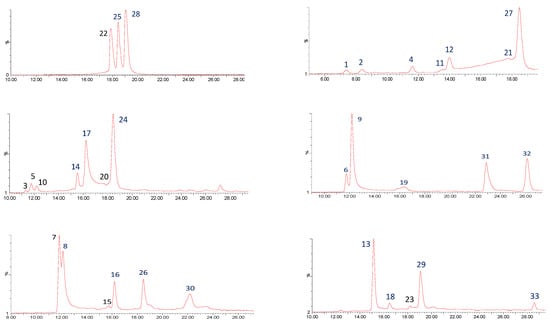 Through the UPLC-QTOF-ESI MS analysis described in the Materials and Methods section, 33 polyphenolic compounds were identified in Costa Rican C. longa rhizomes. Figure 1 shows the chromatograms for these compounds and Table 2 summarizes the analysis results for the 33 curcuminoids in the samples (n = 12).