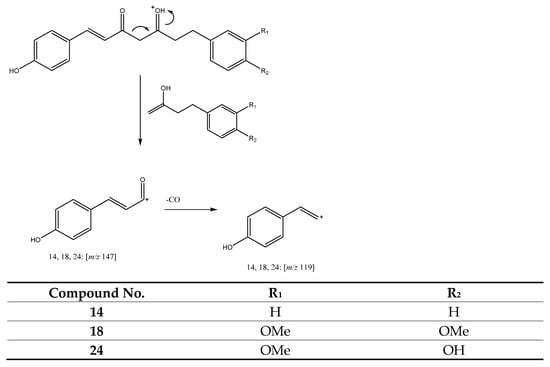 Peaks 14 (Rt = 15.52 min) and 18 (Rt = 16.46 min) were tentatively assigned to 1-(4-hydroxyphenyl)-7-phenylhept-1-ene-3,5-dione at [M + H]+ at m/z 295.1313 (C19H19O3) and 7-(3,4-dimethoxyphenyl)-1-(4-hydroxyphenyl)hept-1-ene-3,5-dione at [M + H]+ at m/z 355.1512 (C21H23O5), respectively. Meanwhile, peak 24 (Rt = 18.43 min) at m/z 341.1379 (C20H21O5) was tentatively assigned to dihydrodemethoxycurcumin. All of these peaks hold a positive charge on C5, present a double bond between C1–C2 and show a product ion at m/z 147, which then undergoes a loss of carbon monoxide (28 uma) to produce the fragment observed at m/z 119, as shown in Figure 4 [27,28].