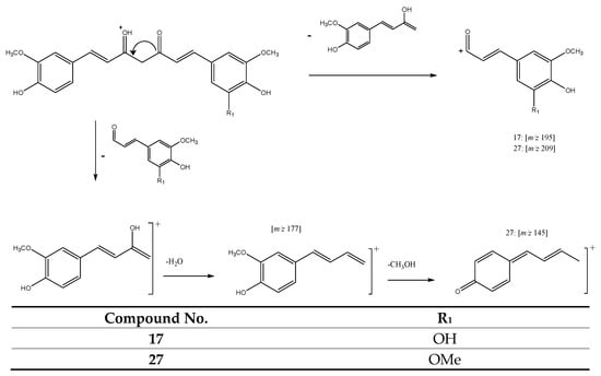 Finally, in this group of compounds, peaks 17 (Rt = 16.21 min) and 27 (Rt = 18.61 min) with [M + H]+ at m/z 385.1276 (C21H21O7) and m/z 399.1408 (C22H23O7) were tentatively assigned to curcumalongin C and 1-(4-hydroxy-3,5-dimethoxyphenyl)-7-(4-hydroxy-3-methoxyphenyl)-1,6-heptadiene-3,5-dione, respectively. Both peaks hold a positive charge in C3 and double bonds between C1-C2 and C6-C7. The fragmentation pathway for both molecules (Figure 5) yields a product ion at m/z 195 for peak 17 and m/z 209 for peak 27. On the other hand, the loss of these fragments followed by the loss of H2O yields for both compounds, a product ion at m/z 177, which in turn produces a fragment at m/z 145 corresponding to additional loss of MeOH [28,29].