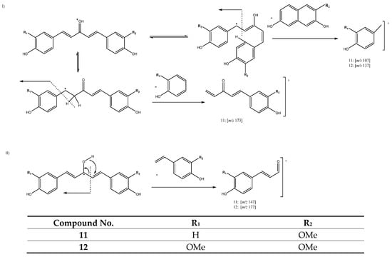 Peaks 11 (Rt = 13.52 min) and 12 (Rt = 13.97 min) also pertain to this group of curcuminoids, with [M + H]+ at m/z 297.1105 (C18H17O4) and m/z 327.1216 (C19H19O5), tentatively identified as 1-(4-hydroxy-3-methoxyphenyl)-5-(4-hydroxyphenyl)penta-1,4-dien-3-one and 1,5-bis(4-hydroxy-3-methoxyphenyl)-1,4-pentadien-3-one, respectively. In fact, these two compounds also have five carbons in their aliphatic chain and a single keto group in C3 but with two double bonds between C1-C2 and C4-C5. They follow two different pathways of fragmentation, as shown in Figure 8. Pathway I is attributed to a reorientation of the molecule that produces the fragments at m/z 107 and m/z 137 for peaks 11 and 12 respectively, while peak 11 suffers the loss of a neutral aryl moiety to yield the fragment at m/z 173 (Figure 8). The other fragmentation pathway (II) is due to a hydrogen transfer, which in turn produces the ion products at m/z 147 and m/z 177, corresponding to peaks 11 and 12, respectively [27,29].