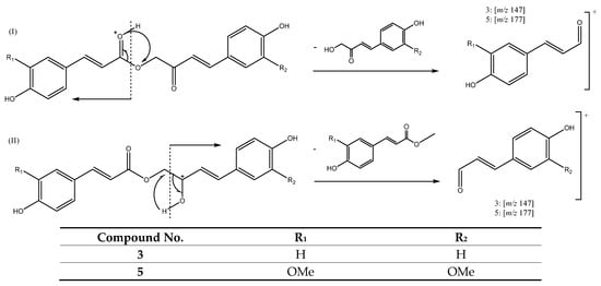 A different group of curcuminoids that holds an ester in C3 and a keto group in C5, includes for instance peak 3 (Rt = 11.47 min), which was tentatively assigned to 4-(4-hydroxyphenyl)-2-oxobut-3-en-1-yl 3-(4-hydroxyphenyl)acrylate with [M + H]+ at m/z 325.1075 (C19H17O5). This group of compounds also includes peak 5 (Rt = 11.71 min), which was assigned to previously reported Calebin A [30] with m/z 385.1276 (C21H21O7). These compounds follow two different fragmentation patterns, as shown in Figure 11. Pathway I comprise a hydrogen rearrangement in the ester group followed by the neutral loss of an aryl group yielding ion products at m/z 147 for peak 3 and at m/z 177 for peak 5. The other fragmentation pathway (II) follows a similar pattern but with a hydrogen rearrangement in the keto group followed by the neutral loss of an aryl group also yielding fragments at m/z 147 for peak 3 and at m/z 177 for peak 5 [26].