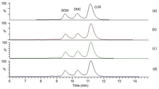UHPLC QTOF-ESI MS extracted ion chromatograms of curcuminoids from C. longa rhizomes, in a Phenomenex Luna RP18 C-18 column (150 mm × 4.6 mm × 4 µm) using a Xevo G2-XS QTOF Mass spectrometer (Waters™, Wilmslow, UK) in a mass range from 100 to 1000 amu.