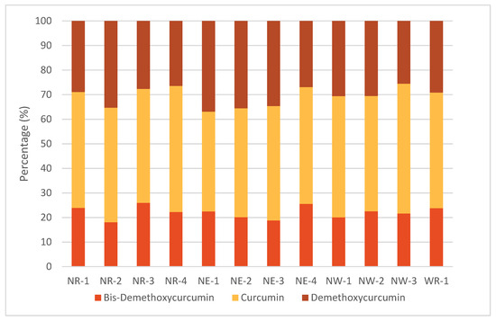 Results for the 3 individual curcuminoids indicate that CUR exhibits the highest content in all 12 samples and BDM is the curcuminoid with the lowest content. For instance, CUR average value for all samples is 42.5 mg/g dry material compared to an average of 28.3 mg/g dry material for DMC and 19.7 mg/g material for BDM, thus accounting for CUR, showing 1.5- and 2.1-fold greater content, respectively. The distribution of CUR, DMC and BDM contents in samples exhibits variability, as shown in Figure 14, with NW-3 showing the highest percentage of CUR (52.8%), while NE-1 shows the highest percentage of DMC (37.0%) and NR-3 holds the highest percentage for BDM (26.0%). Secondary metabolites DMC and BDM show the highest percentage in NE-1, where they hold 59.4% of the TC content, while they show their lowest percentage in NW-3, where they represent 47.2% of the TC content.
