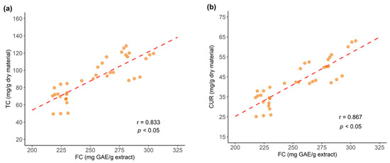 Further correlation studies between NO results with Folin–Ciocalteau (FC) reducing capacity results (Figure 18b) and UPLC total curcuminoids (TC) content (Figure 18c) were also performed, with findings indicating a negative correlation (p < 0.05) with FC and TC (r = −0.780 and r = −0.726, respectively). In respect to individual curcuminoids content, findings indicated similar contribution from CUR, DMC and BDM, all with low correlation values. These results are in agreement with previous results, evidencing that besides the methoxy and phenolic groups, the 1,3-diketone system might play an important role in nitric oxide (NO) scavenging, since all three curcuminoids showed similar NO scavenging activity [62,63].