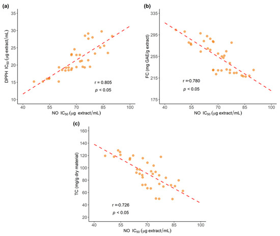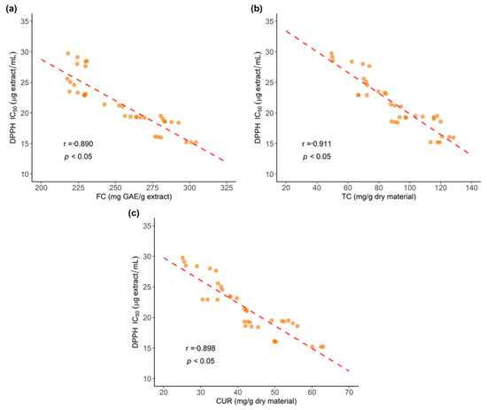 Correlation of antioxidant activity assessed through the Nitric Oxide (NO) radical scavenging and: (a) DPPH antioxidant activity (b) Folin–Ciocalteu (FC) reducing capacity results; (c) total curcuminoids (TC) content determined by UPLC-DAD.