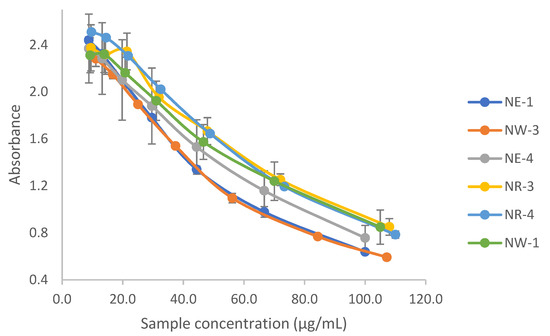 Nitric oxide (NO) was produced from sodium nitroprusside (SNP) and rapidly transformed into nitrite, which is a stable product. The nitrite concentration was determined by the Griess reaction [24]. SNP (5 mM) was mixed with different concentrations of polyphenol extracts (8–100 µg/mL) and a control of SNP without polyphenols was also prepared. Trolox was used as the control. All the mixtures were prepared in 96-well plates and incubated for 60 min in direct light to enhance NO production. Later, the Griess reagent (1% sulfanilamide and 0.1% naphthylethylenediamine dihydrochloride in 2% H3PO4) was added, incubated for 6 min and the absorbance was read at 540 nm. Sample blanks were prepared for each polyphenol concentration. The percentage of the NO-scavenging activity of the extract was calculated with the following equation: