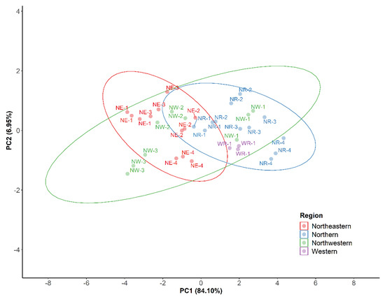 Graphic representation of the plane defined by the two first principal components (PC1 and PC2) deriving from the PCA analysis of C. longa rhizomes (n = 12) contents. Regions: Northeastern (NE), Northern (NR), Northwestern (NW), Western (WR).