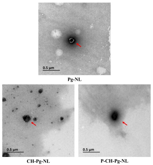 The morphological features and drug loading in liposomal systems were confirmed by TEM (Figure 1). All nanoliposomal systems were smooth surfaces, close to spherical shape, and small unilamellar vesicles. Pg-NL had outer visible phospholipid bilayer and inside blackish color, which indicates the drug loading. However, the CH-Pg-NL showed the solid black color with invisible phospholipid bilayer and drug, which confirms the successful coating of Pg-NL by chitosan. In contrast, we found an ash-like shadow layer in P-CH-Pg-NL particle. In addition, the size of P-CH-Pg-NL was bigger than that of CH-Pg-NL, which confirms the coating of pectin on to CH-Pg-NL. These results were supported by the previously published research [10,35]. Therefore, both DLS and TEM results confirm that uncoated-nanoliposomes had smaller particle size; consequently, electrostatic chitosan coating and then pectin coating significantly increased the particle size (Table 1 and Figure 1).