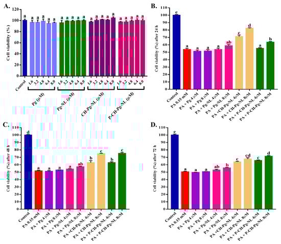 Effects of free-Pg and Pg-loaded liposomal systems on cytotoxicity and PA-induced lipotoxicity in L02 cells. (A) Cells were treated for 24 h with 1.6–8.0 μM of free-Pg and Pg-loaded nanoliposomes, and cell viability was evaluated by MTT assay (% of control). (B–D) Cells were treated for 24 h with 0.15 mM PA with or without free-Pg and Pg-loaded nanoliposomes for 24, 48, and 72 h, accordingly. After that, cell viability was evaluated by MTT assay (% of control). Individual alphabet represents the significant difference (p < 0.05) of all treatment groups. Here, PA = palmitic acid; Pg-NL = Pelargonidin-3-O-glucoside-loaded uncoated nanoliposomes; CH-Pg-NL = Pg-NL coated by chitosan; P-CH-Pg-NL = CH-Pg-NL coated by pectin.