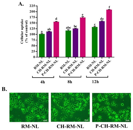 Cellular uptake of rhodamine 123 (RM, 5 μM)-loaded nanoliposomes (RM-NL, CH-RM-NL, and P-CH-RM-NL) to L02 cells. L02 cells were incubated with RM-loaded nanoliposomes for 4, 8, and 12 h, accordingly (A) The values of fluorescence intensity of RM-loaded nanoliposomes. Individual alphabet represents the significant difference (p < 0.05) of all treatment groups. (B) The photograph of fluorescence intensity of the RM-loaded nanoliposomes after 12 h of incubation. Here, RM-NL = rhodamine 123-loaded uncoated nanoliposomes; CH-RM-NL = RM-NL coated by chitosan; P-CH-RM-NL = CH-RM-NL coated by pectin.
