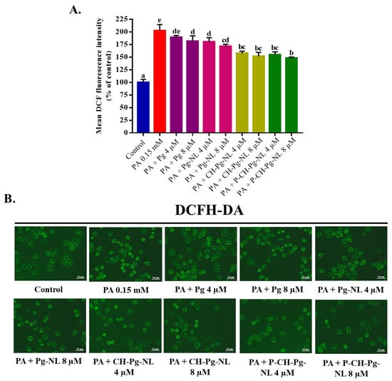 Effects of free Pg and Pg-loaded liposomal systems on PA-induced intracellular ROS production in L02 cells. (A) Quantitative determination of ROS as “% of mean DCF fluorescence intensity compared to control”. (B) Qualitative determination of ROS by “photographs of DCFH-DA fluorescence intensity of different samples”. Individual alphabet represents the significant difference (p < 0.05) of all treatment groups. Here, PA = palmitic acid; Pg-NL = Pelargonidin-3-O-glucoside-loaded uncoated nanoliposomes; CH-Pg-NL = Pg-NL coated by chitosan; P-CH-Pg-NL = CH-Pg-NL coated by pectin.