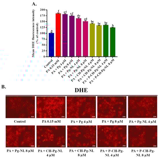 Effects of free-Pg and Pg-loaded liposomal systems on PA-induced intracellular superoxide anion radical (O2•−) generation in L02 cells. (A) Quantitative determination of O2•− as “% of mean DHE fluorescence intensity compared to control”. (B) Qualitative determination of O2•− by “photographs of DHE fluorescence intensity of different samples”. Individual alphabet represents the significant difference (p < 0.05) of all treatment groups. Here, PA = palmitic acid; Pg-NL = Pelargonidin-3-O-glucoside-loaded uncoated nanoliposomes; CH-Pg-NL = Pg-NL coated by chitosan; P-CH-Pg-NL = CH-Pg-NL coated by pectin.