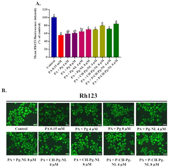 A myriad of studies confirmed that mitochondrion plays an important role in ROS homeostasis and its dysfunction. Mitochondrial dysfunctions, such as collapse of mitochondrial membrane potential (MMP), reduction of mitochondrial mass, and others, are the responsible feature of cell death [4,44]. A recent study reported that PA treatment induced the cells death of H9C2 and primary cardiomyoblast of rats via mitochondrial dysfunction [45]. Thus, we detected the mitochondrial membrane potential (MMP) using RH123 fluorescence probe. According to our study, the MMP was excessively declined in PA-treated L02 cells (55.04 ± 3.19%) compared to control cells (100 ± 3.44%). On the contrary, Pg-loaded liposomal systems significantly (p < 0.05) restored the MMP compared to PA-treated group, while both CH-Pg-NL and P-CH-Pg-NL samples exhibited similar results (Figure 6A,B). We also found improved results for uncoated nanoliposomes samples compared to free-Pg samples (Figure 6A,B), which indicate the instability of free-Pg samples during treatment in culture medium. Therefore, liposomal samples could be an effective carrier for cellular delivery of bioactive molecules to suppress the mitochondrial dysfunction [46].