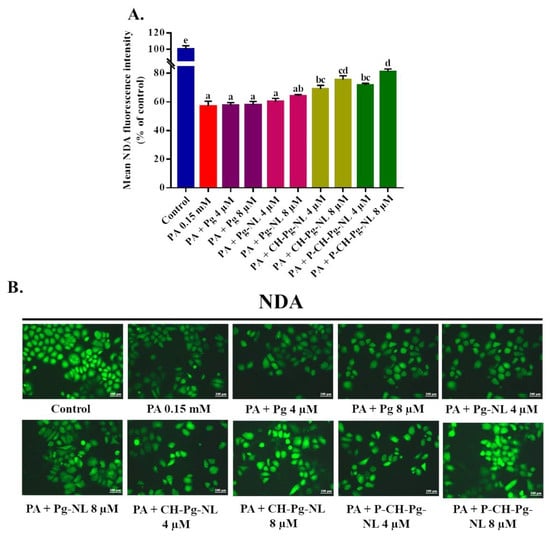 Glutathione (GSH) is a linear tripeptide, which is composed of three amino acids such as L-glutamine, L-cysteine, and glycine. GSH plays a major role to maintain the redox homeostasis of cells. GSH is capable of preventing cellular components damage caused by ROS [47,48]. Several studies revealed that PA exposure is responsible for cellular GSH depletion [49,50,51]. Therefore, we examined the cellular GSH depletion using NDA fluorescence probe. According to the result, PA exerted the greater GSH depletion with 56.97 ± 3.48% mean NDA fluorescence intensity compared to control (100 ± 4.50%). On the contrary, pretreatment of CH-Pg-NL and P-CH-Pg-NL samples for 48 h significantly restored the cellular GSH content compared to PA-treated group (Figure 7A,B). Even at low concentration, coated nanoliposomes were capable of improving the GSH depletion. Interestingly, Pg-NL samples insignificantly restored the cellular GSH content, while free-Pg samples were unable to ameliorate the GSH depletion. The lower result of uncoated nanoliposomes (Pg-NL) was associated with instability in physiological environment [10], and the lowest result of free-Pg was associated with instability in harsh environments [43].