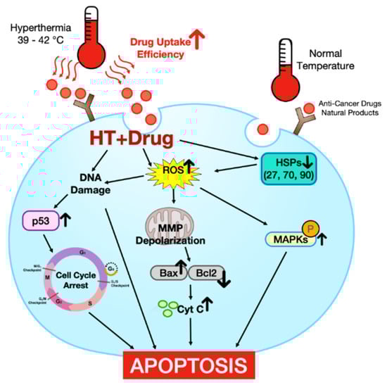 Vertrees et al. reported a 5.7-fold increase in TRAIL and insignificant changes in TNF-α, FAS-L, and caspases-3, 8, 9 in transformed cells (isogenic human lung cancer cell line transformed with H-ras) after HT at 43 °C for 3 h. This study reported the upregulation of TRAIL in H-ras transfected cells, cancer apoptosis, and a disruption in the MAPK pathway that partially fitted this requirement [43]. In 2015, Qin et al. found that HT at 43 °C for 40 min decreased the expression of Survivin, prevented its binding to X-linked inhibitor of apoptosis protein (XIAP), activated caspase-3, and induced apoptosis in EC109 esophageal cancer cells [44]. Mantso et al. showed that low HT (43 °C) triggered extrinsic and intrinsic apoptotic pathways, both apoptosis pathways associated with the activation of caspase-6 in human malignant melanoma cells A375 and A431. After high HT (45 °C), caspase-3, 7, and 6 worked together. Furthermore, there were significant activities in the ER under both HT, suggesting that ER plays an essential role in HT-induced apoptosis through the activation of CCAAT/enhancer binding protein homologous protein (CHOP). Inositol-requiring enzyme 1 and activating transcription factor 6 (ATF 6) were activated by low HT, but PERK was also activated by high HT, suggesting that ER stress can induce CHOP through different transmitting signals [45].
