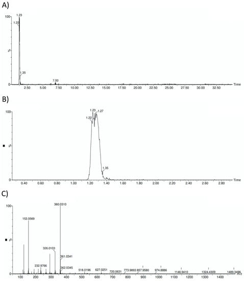 HOFE chromatograms and mass spectrum. (A) General HOFE chromatogram in which hydroxytyrosol peak appears at a retention time of 1.23 min. (B) Amplified chromatogram with detail of hydroxytyrosol peak. (C) Negative mass spectrum of HOFE. Hydroxytyrosol has a negative mass of 153.0569.