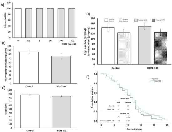 Toxicity assessment of HOFE in N2 C. elegans strain. (A) Lethality. (B) Pharyngeal pumping. (C) Growth. (D) Reproduction and fertility. (E) Kaplan-Meier survival curves representative of long-term in vivo toxicity. Results are expressed as mean ± SEM.