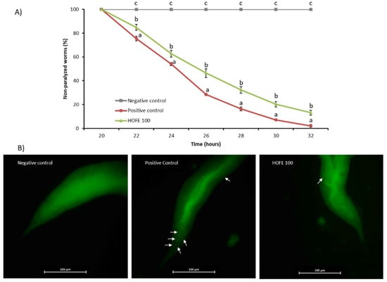 HOFE (100 μg/mL) effect on Aβ-induced paralysis CL4176 nematodes. (A) Paralysis curve. For each time, different letters represent statistically significant differences (p < 0.05) between groups. Results are expressed as mean ± SEM. (B) Typical images from each experimental group presenting Thioflavin T aggregates in worms at 26 h after temperature shifting (40× magnification). Aβ aggregates are indicated with white arrows. Negative control is represented by the non-paralyzable strain CL802. Positive control is the non-treated CL4176.
