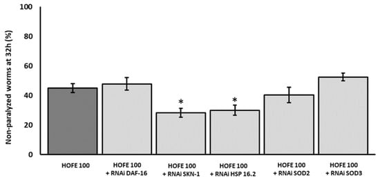Effect of the different RNAi (HSP-16.2, SOD-3, SOD-2, SKN-1, and DAF-16) in a paralysis assay in CL4176 worms treated on HOFE at 100 μg/mL. Data are presented as mean ± standard error of the mean. An * means significant differences (p < 0.05) with respect to worms non-exposed to RNAi and treated on HOFE.