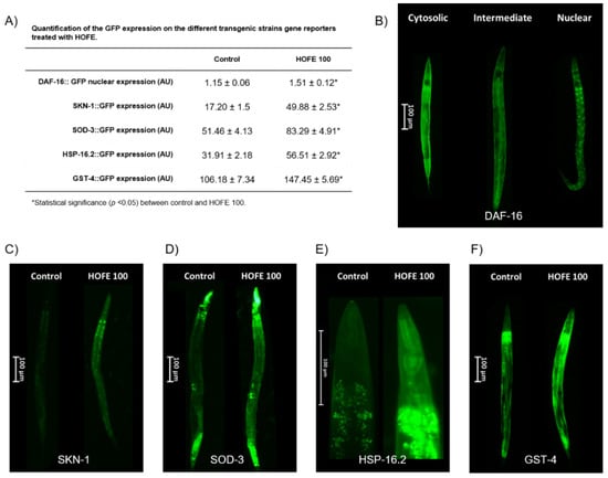 Effects of the 100 μg/mL HOFE on transgenic worms. (A) GFP quantification. (B) Representative pictures of DAF-16::GFP categorization. (C) Representative pictures of SKN-1::GFP worms. (D) Representative pictures of SOD-3::GFP nematodes. (E) Representative pictures of HSP-16.2::GFP worms. (F) Representative pictures of GST-4::GFP nematodes. Results are presented as the mean ± standard error of the mean. * Significant difference (p < 0.05) vs. control.