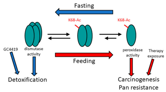 Thus, MnSOD may switch from a tetrameric dismutase to a monomeric peroxidase in response to specific cellular stress conditions, such as nutrient status and/or transformation (Figure 1). In this model, we posit that genetic or metabolic abnormalities dysregulate MnSOD-Ac and shift the balance towards higher monomer levels with decreased tetramer. The MnSOD-Ac, while accommodating the metabolic needs of the cell, may also function as a tumor promoter under specific conditions. Lastly, it is surmised that the SIRT3-MnSOD signaling axis may also be a potential therapeutic molecular target, including agents such as GC4419 (Galera Therapeutics, Inc. Malvern, PA, USA), which chemically dismutase/detoxify superoxide instead of enzymatic removal by MnSOD [87].