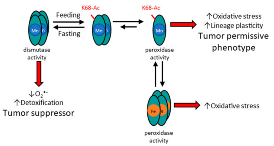 In conclusion, the data in this review article suggest that MnSOD-Ac, including K68-Ac, may function as an oncoprotein in an advanced stage of cancer, in contrast to the more traditional premise that MnSOD is a detoxification TS (Figure 2), and this dual function may arise from the presence of two structural forms of MnSOD. As such, it is surmised that acetylation status of MnSOD-K68 is a molecular switch that directs its enzymatic detoxification from its antioxidant activity (i.e., metabolic stress/protective function) as a tumor suppressor (tetrameric) or as a oncoprotein (monomeric) and, most importantly, that may promote a tumor-permissive phenotype through lineage-plasticity-like properties. This idea has, over the last decade, led to multiple publications suggesting a potential link between mitochondrial function, and dysregulation, in the lineage cell fate and plasticity in both stem cells, as well as tumor cells. It also expands the theme that the mitochondria, perhaps through small reactive oxygen species (ROS), may relay signals to the other parts of the cell to maintain both metabolic and bioenergetic equilibrium. The disruption of these pathways, through one of many potential processes, may lead to permissive phenotypes for human illness, including malignancies.