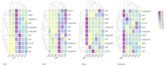 The presence of anthocyanins positively correlated with the accumulation of transcripts of both regulatory and structural genes of the anthocyanin biosynthetic pathway (Figure 2, Table 6). Most studies conclude that R2R3-MYBs affect the expression of LBGs (F3′5′H, DFR, ANS, UFGT, GST); however, contradictory results are available on their effect on the EBGs (CHI, CHS, F3H) of the pathway [4,18,46]. The expression level of both ANS and DFR coincided with the higher expression of regulatory MYBs. Their expression was higher in those stages where the berries are still rich in anthocyanins; furthermore, a great fold of difference was observed in transcript levels between the anthocyanin-pigmented and anthocyanin-less genotypes (Figure 2). Interestingly, the transcript level of EBGs, CHS and F3H followed the expression of the studied MYB transcription factors, as opposed to Borovsky et al. and Aza-Gonzalez et al., who found that expression of CHS is comparable between the anthocyanin-rich and anthocyanin-less genotypes [4,18]. On the other hand, Stommel et al. detected higher transcript levels of CHS in the anthocyanin-pigmented genotypes; in fact, upon silencing the MYBa, Ochoa-Alejo et al. and Zhang et al. detected the down regulation of both LBGs and EBGs [46,47,48].