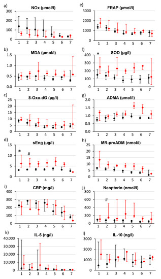The main objective of the present study was to explore the kinetics of several oxidative-stress-related biomarkers in seven consecutive time points of septic shock, and thus to identify the most interesting biomarkers for further clinical investigation. With the intention to study pro-oxidant and antioxidant processes separately, we chose substances related to the two opposing mechanisms: (a) biomarkers that show the level of oxidative stress and subsequent tissue damage: nitrite/nitrate (NOx), malondialdehyde (MDA), 8-oxo-2’-deoxyguanosine (8-oxo-dG) and soluble endoglin (sEng); (b) biomarkers of antioxidant mechanisms: the ferric reducing ability of plasma (FRAP), Cu/Zn-superoxide dismutase (SOD), asymmetric dimethylarginine (ADMA) and mid-regional pro-adrenomedullin (MR-proADM). Aiming to compare the extent of oxidative stress with the extent of inflammation, we also decided to analyse inflammatory biomarkers (c), namely C-reactive protein (CRP), neopterin, pro-inflammatory cytokine interleukin 6 (IL-6) and anti-inflammatory cytokine interleukin 10 (IL-10).