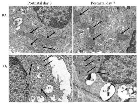 Representative photomicrographs of transmission electron microscopy in mice lung tissue. The alveolar type II epithelial cells of hyperoxia group exhibited abnormal mitochondrial morphology (black arrow) typical of ferroptosis, including shrunken mitochondria, increase density and rupture of membranous structure, and decrease mitochondrial cristae. LB, lamella body.