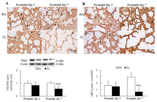Representative immunohistochemistry and representative Western blots for (A) VEGF and (B) representative immunohistochemistry of vWF and semiquantitative analysis for vascular density in mice. The mice reared in RA and hyperoxia exhibited similar VEGF (black arrow) and vWF (black arrow) immunoreactivity on postnatal day 3, and the mice reared in hyperoxia exhibited a significantly lower VEGF and protein expression and a significantly lower vWF immunoreactivity and vascular density (black arrow) than the mice reared in hyperoxia on postnatal day 7. n = 7 mice at each postnatal day. *** p < 0.001.