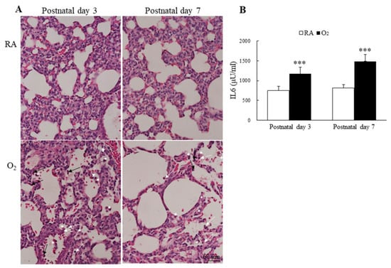 (A) Representative H&E-stained lung sections and (B) lung IL-6 levels. The mice reared in hyperoxia exhibited numerous inflammatory cells in the alveolar space, neutrophils (black arrow), small lymphocyte (white arrow), and alveolar macrophage (white asterisks). The mice reared in hyperoxia exhibited a significantly higher lung IL-6 levels than the mice reared in RA. n = 7–11 mice at each postnatal day. *** p < 0.001.