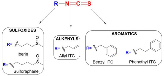 Schematic representation of the segregation of ITCs based on the type of the R group (sulfoxides, alkenyls, and aromatics).