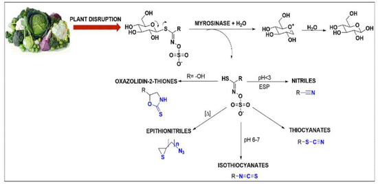 Hydrolysis of GSLs via enzymatic catalysis by myrosinase is activated upon tissue plant disruption. The formed aglucone can be rearranged into oxazolidin-2-thiones, nitriles, epithionitres, thiocyanates, and ITCs.
