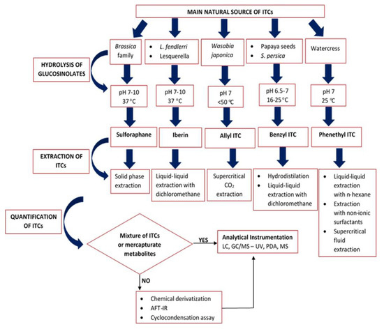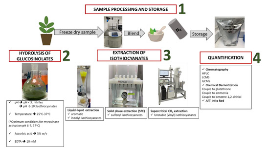 A general protocol that includes the experimental pipeline for the determination of ITCs content from naturally-derived sources is divided in four pillars, namely (i) sample storage and isolation, (ii) hydrolysis of GSLs, (iii) extraction of ITCs, and eventually (iv) their quantification (Figure 4).