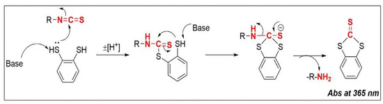 A study by Fabian et al. (1967) was the first one that attempted to quantify ITCs [288]. This was achieved by reacting propyl ITC with 2,3-dimercaptopropanol in aqueous solution of moderated basicity [288]. The continuous ultra-violet (UV) monitoring of the reaction suggested the (rapid) formation of a product carrying the dithiocarbamate moiety with characteristic maximal absorption at 270 nm. Further incubation of this dithiocarbamate intermediate led to the development of a high intensity spectra with a single isosbestic point at 287 nm [288]. Later, in a study performed by Zhang et al. (1992), the authors isolated, purified, and characterized the isolated product, documenting the presence of a cyclic thione called 4-hydroxymethyl-1,3-dithiolane-2-thione [289]. The mechanism of the reaction suggested that the centre carbon atom of the isothiocyanate group of ITCs undergoes nucleophilic attack by a thiol group of a vicinal dithiol system, leading initially in the formation of the unstable dithiocarbamate molecule [290]. Intramolecular cyclization and consequent degradation of dithiocarbamate into a five membered 1,3-dithiolane-2-thione was shown to be promoted by a second nucleophilic attack of the unreacted thiol group (adjacent thiol group), upon prolonged standing [290]. Despite the fact that intramolecular cyclization between ITCs and vicinal amino or thiol groups had previously been demonstrated, a cyclo-condensation with vicinal dithiols had not been reported before thereby suggesting a new chemical reaction of ITCs [290,291]. This cyclo-condensation reaction was subsequently shown to be useful in generating primary amines from alkyl and aryl ITCs, but it was also realized that this reaction can be applied into the quantification of ITCs by measuring the absorbance of the formed cyclic product [291,292]. Further optimization of the cyclo-condensation reaction was performed by screening several vicinal dithiol substrates, demonstrating that reaction of ITCs with 1,2-benzenedithiol (BDT) can lead to the rapid formation of a very stable 1,3-benzodithiole-2-thione with high molar extinction coefficient at the long wavelength (ε = 23,000 M−1 cm−1 at 365 nm) (Figure 6) [289].
