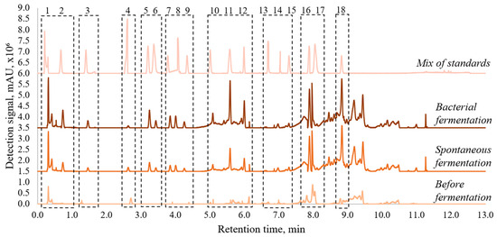 Analysis of biologically active substances by ultra-performance liquid chromatography with a diode array detector (UPLC-DAD) was performed to evaluate the influence of fermentation on the qualitative and quantitative composition of phenolic compounds in pollen samples. During the study, validation of the method was performed, and all parameters met requirements. Accuracy and repeatability standard deviations were 0.01% and linearity R² = 0.999 of each standard listed in Table 3. Seventeen standard solutions were used to identify the predominant phenolic compounds in the samples, which were evaluated both before and after bacterial/spontaneous fermentation. UPLC-DAD also allowed evaluation of the content of lactic acid, which is an important parameter of successful lactic acid fermentation and helps to preserve bee bread in the hive [1,19].