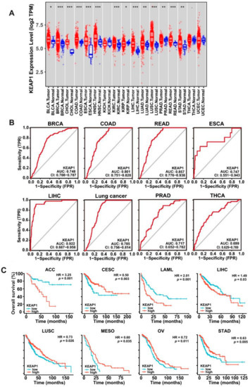 KEAP1 expression across cancers and its prognostic implications. (A) Box plots showing the distribution of KEAP1 mRNA expression in 17 types of cancer versus normal tissues based on the TCGA database. * p < 0.05, ** p < 0.01, *** p < 0.001. (B) ROC analysis of KEAP1 expression for distinguishing cancers from normal tissues. BRCA, breast invasive carcinoma; COAD, colon adenocarcinoma; RSAD, rectum adenocarcinoma; ESCA, esophageal carcinoma; LIHC, liver hepatocellular carcinoma; PRAD, prostate adenocarcinoma; and THCA, thyroid carcinoma. (C) Kaplan–Meier analysis showing that KEAP1 expression was linked to overall survival in eight cancer types based on the TCGA database. BLCA, Bladder Urothelial Carcinoma; BRCA, Breast invasive carcinoma; CHOL, Cholangio carcinoma; COAD, Colon adenocarcinoma; ESCA, Esophageal carcinoma; HNSC, Head and Neck squamous cell carcinoma; KICH, Kidney, Chromophobe; KIRP, Kidney renal papillary cell carcinoma; LIHC, Liver hepatocellular carcinoma; LUAD, Lung adenocarcinoma; LUSC, Lung squamous cell carcinoma; PRAD, Prostate adenocarcinoma; READ, Rectum adenocarcinoma; STAD, Stomach adenocarcinoma; THCA, Thyroid carcinoma; UCEC, Uterine Corpus Endometrial Carcinoma; ACC, Adrenocortical carcinoma; CESC, Cervical squamous cell carcinoma; LAML, Acute Myeloid Leukemia; MESO, Mesothelioma; OV, Ovarian serous cystadenocarcinoma.