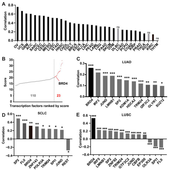 Bioinformatics analysis of factors modulating KEAP1 expression. (A) Copy number variation (CNV) contribution to KEAP1 expression using the MEXPRESS database. (B) Distribution of the predicted score sequencing of 139 transcription factors binding to the KEAP1 promoter. (C–E) Histogram showing the mRNA expression correlation between BRD4 and KEAP1 based on the TCGA dataset-LUAD (C), TCGA dataset-LUSC (D), and in SCLC primary tumors (E, n = 81). ns > 0.05; * p < 0.05; ** p < 0.01; *** p < 0.001 (Student’s t-test). SCLC, small cell lung cancer; UCS, Uterine Carcinosarcoma; GBM, Glioblastoma multiforme; SARC, Sarcoma; TGCT, Testicular Germ Cell Tumors; LGG, Brain Lower Grade Glioma; PAAD, Pancreatic adenocarcinoma; SKCM, Skin Cutaneous Melanoma; UVM, Uveal Melanoma; DLBC, Lymphoid Neoplasm Diffuse Large B-cell Lymphoma; PCPG, Pheochromocytoma and Paraganglioma; KIRC, Kidney renal clear cell carcinoma; and THYM, Thymoma.