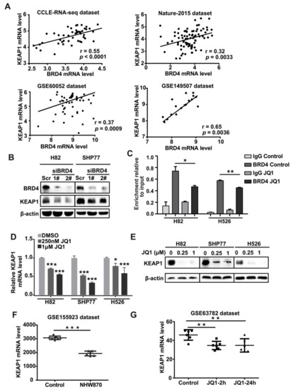 To further characterize the correlation between KEAP1 and BRD4 at the mRNA level in SCLC, we interrogated multiple SCLC RNA-seq and microarray data sets for KEAP1 and BRD4 expression. A primary SCLC data set generated by George et al. [30] (81 human primary SCLC samples) displayed that BRD4 expression was highly positively correlated with KEAP1 expression. Similar correlation patterns were observed in the GSE149507, GSE60052, and CCLE SCLC RNA-seq data sets (Figure 3A). In contrast, BRD2 and BRD3, two additional BET (bromodomain and extra-terminal domain) family members, exhibited no or low correlation coefficients with KEAP1. These data suggest that BRD4 might be the primary BET member responsible for the regulation of KEAP1. To provide mechanistic evidence of the potential regulation of KEAP1 by BRD4, we silenced BRD4 by siRNA in H82 and SHP77 SCLC cells, and then BRD4 and KEAP1 expression was validated by RT-qPCR and Western blotting. As depicted in Figure S3B, effective knockdown of BRD4 markedly decreased KEAP1 expression in both H82 and SHP77 cells (Supplementary Figure S3A,B). Following the RT-qPCR results, western blot analysis demonstrated a down-regulation of KEAP1 upon BRD4 knockdown at the protein level (Figure 3B, Supplementary Figure S5A). Then, we performed BRD4 chromatin immunoprecipitation (ChIP) followed by qPCR analysis to evaluate whether BRD4 transcriptionally activated KEAP1. The results showed that BRD4 is directly bound to the promoter region of KEAP1. As expected, treatment with JQ1, a specific inhibitor of BRD4, led to markedly decreased binding of BRD4 at the promoter of KEAP1 in H82 and H526 cells (Figure 3C). Notably, JQ1 treatment resulted in a dose-dependent down-regulation of KEAP1 at the mRNA and protein levels in H82, SHP77, and H526 cells (Figure 3D,E, Supplementary Figure S5B). We also extracted KEAP1 expression data from two GEO datasets and analyzed the effect of BET inhibitors on the KEAP1 expression. The results showed that JQ1 caused a dose-dependent decrease in KEAP1 in four SCLC cell lines in the GSE63782 data set. We also found that NHW870, another BET inhibitor, down-regulated KEAP1 in an SCLC PDX model (Figure 3F,G). Altogether, these data validated that BRD4 directly binds to the KEAP1 promoter and positively regulates its expression in SCLC cells.
