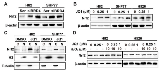 The KEAP1-Nrf2 axis is one of the most important cellular defense pathways against oxidative and electrophilic stress. We analyzed several public data sets for nuclear factor (erythroid-derived 2)-like 2 (NFE2L2) expression. As shown in Figure S3C, NFE2L2 was lower in SCLC tissues/cells than adjacent non-tumor tissues in the GSE145907 data set and LUAD cells in the CCLE RNA-seq data set (Supplementary Figure S3C). Impaired KEAP1 expression mediated by BRD4 might influence its association with Nrf2, promoting Nrf2 stability by preventing Nrf2 degradation. Therefore, we evaluated Nrf2 expression by RT-qPCR and Western blotting to determine whether Nrf2 expression was affected with BRD4 knockdown or JQ1 treatment. Notably, knockdown of BRD4 using siRNA or treatment of H82 and H526 cells with JQ1 had no significant effect on the transcription of NFE2L2 (Supplementary Figure S3D,E). However, BRD4 depletion triggered the accumulation of Nrf2 at the protein level in both H82 and SHP77 cells. Similarly, JQ1 treatment induced a dose-dependent up-regulation of NFR2 in H82, SHP77, and H526 cells (Figure 4A,B, Supplementary Figure S5C,D). Following the down-regulation of KEAP1, Nrf2 would no longer be sequestered by KEAP1 and translocate and accumulate in the nucleus. We then checked whether the nuclear fraction of Nrf2 increased following JQ1 treatment. The nuclear-cytoplasmic separation assay demonstrated that Nrf2 was more translocated and retained in the nucleus in the presence of JQ1 in H82 and SHP77 cells (Figure 4C, Supplementary Figure S5E). External oxidative stress also disassociates KEAP1 from Nrf2 and leads to the accumulation of Nrf2 so we treated cells with hydrogen peroxide in the presence or absence of JQ1 and detected Nrf2 protein by western blotting. As shown in Figure 4D, the perturbation of redox homeostasis by hydrogen peroxide could further lead to the dose-dependent accumulation of Nrf2 in H82 and H526 cells. These results suggested that either BRD4 depletion or blocking the binding of BRD4 to the KEAP1 promoter by JQ1 indeed activates the KEAP1-Nrf2 signaling pathway. In addition, a previous study reported that Fs(1) h, the fly ortholog of BET member, physically interacts with CncC, the ortholog of Nrf2 in Drosophila, and inhibits its activity at the posttranslational level. We tested the possible interaction between BRD4 and Nrf2 in SCLC cells by co-immunoprecipitation (Co-IP) analysis. The co-IP experiment unveiled an interaction between BRD4 and Nrf2 in H82, SHP77, and H526 cells. Importantly, JQ1 treatment weakened the binding rate of Nrf2 and BRD4 (Figure 4E). These data suggest that BRD4 can modulate Nrf2 activity through indirect regulation by KEAP1 and direct protein-protein regulation.