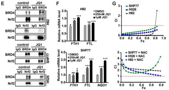 Blocking BRD4 results in the accumulation of Nrf2. (A,B) Western blot analysis of Nrf2 upon BRD4 knockdown or JQ1 treatment (B) in H82 and SHP77 cells. (C) Western blot analysis indicating the distribution of Nrf2 upon JQ1 treatment in H82 and SHP77 cells Tubulin serves as a reference protein in the cytoplasm and H3 as a reference protein in the nucleus. (D) Western blot analysis of Nrf2 in H82 and H526 cells with or without H2O2 after treatment with JQ1. (E) Co-IP experiments demonstrating the interaction of BRD4 and Nrf2 upon JQ1 treatment. (F) RT-qPCR analysis of FTH1, FTL, and NQO1 upon JQ1 treatment in H82 and SHP77 cells. (G) CellTiter-Glo Luminescent assays demonstrating the effects of the combination of ATRA and JQ1 with (lower panel) or without NAC (upper panel) in H82, SHP77, and H526 cells. ns > 0.05; * p < 0.05; ** p < 0.01; *** p < 0.001 (Student’s t-test).