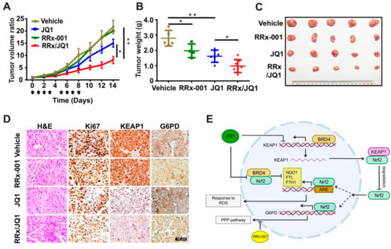 Co-targeting BRD4 and G6PD suppresses SCLC in vivo. (A) Tumor volume curves of H82 xenograft mice treated with RRx-001, JQ1, or a combination of RRx-001 and JQ1. The arrow represents the time of drug injection. (B) Tumor weights of H82 xenograft mice after 14 days of drug treatment. (C) Imaging of representative tumors excised at each group’s end of the experiment. (D) Representative immunohistochemistry images of Ki67, KEAP1, and G6PD on each group. Scale bar, 50 μm. (E) Model for targeting the BRD4-KEAP1-Nrf2-G6PD axis in SCLC cells. RRx, RRx-001. * p < 0.05; ** p < 0.01 (Student’s t-test).