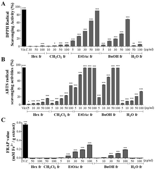 According to the FRAP assay, the quantified value was significantly increased in only two fractions, the EtOAc and BuOH fractions, in a concentration-dependent manner. In addition, the efficacy of the fractions in the FRAP assay was the weakest among the three antioxidant methods.