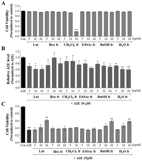 The suppressive effects of the fractions on A2E-induced cell death in ARPE-19 cells were evaluated (Figure 4C). A2E (25 µM) decreased APRE-19 cell viability, and pretreatment with lutein effectively reduced the effect of A2E on ARPE-19 cells. Of the five fractions, only two, BuOH and H2O, were shown to inhibit A2E-induced cell death in a concentration-dependent manner. The experimental group pretreated with BuOH fraction and H2O fraction at 30 µg/mL showed a cell viability of 58.3% and 58.4%, which was 1.65 times higher than that of the A2E-treated control group. The cell viability obtained by pretreatment with the BuOH and H2O fractions at 30 µM was not significantly different from that of lutein at 30 µM.