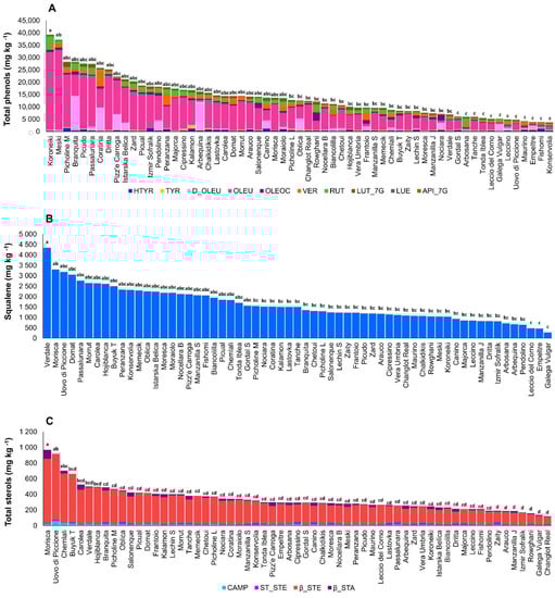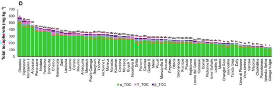 The variation in phenol (A), squalene (B), sterol (C), and tocopherol (D) content in 61 olive cultivars by two-year average (expressed as mg kg−1 of fresh fruit pulp). Different letters correspond to significantly different values of total phenols, total sterols, and total tocopherols at p ≤ 0.01.