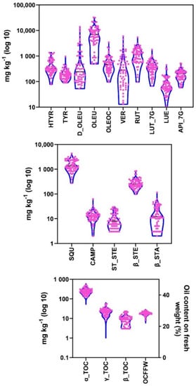 Violin graphs representing trait variation between two consecutive crop seasons. Each plot shows the distribution of data for 61 cultivars from the minimum to the maximum level, with horizontal inner line showing the data median. The horizontal width of the violin depends on the data density. The pink circles represent the 61 olive cultivars. The data are expressed as mg kg−1 of fruit pulp. The analyzed traits included phenols—hydroxytyrosol (HTYR), tyrosol (TYR), demethyloleuropein (D_OLEU), oleuropein (OLEU), oleocanthal (OLEOC), verbascoside (VER), rutin (RUT), luteolin -7-glycoside (LUT_7G), luteolin (LUE), apigenin-7-glycoside (API_7G); squalene and sterols—squalene (SQU), campesterol (CAMP), stigmasterol (ST_STE), β-sitosterol (β_STE), β-sitostanol (β_STA); tocopherols—α-tocopherol (α_TOC), γ-tocopherol (γ_TOC), β-tocopherol (β_TOC); and oil content on fruit fresh weight (OCFFW).